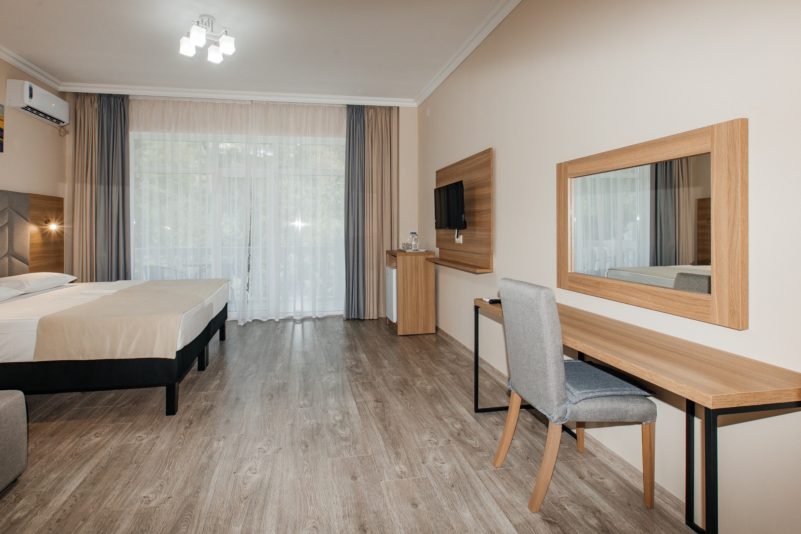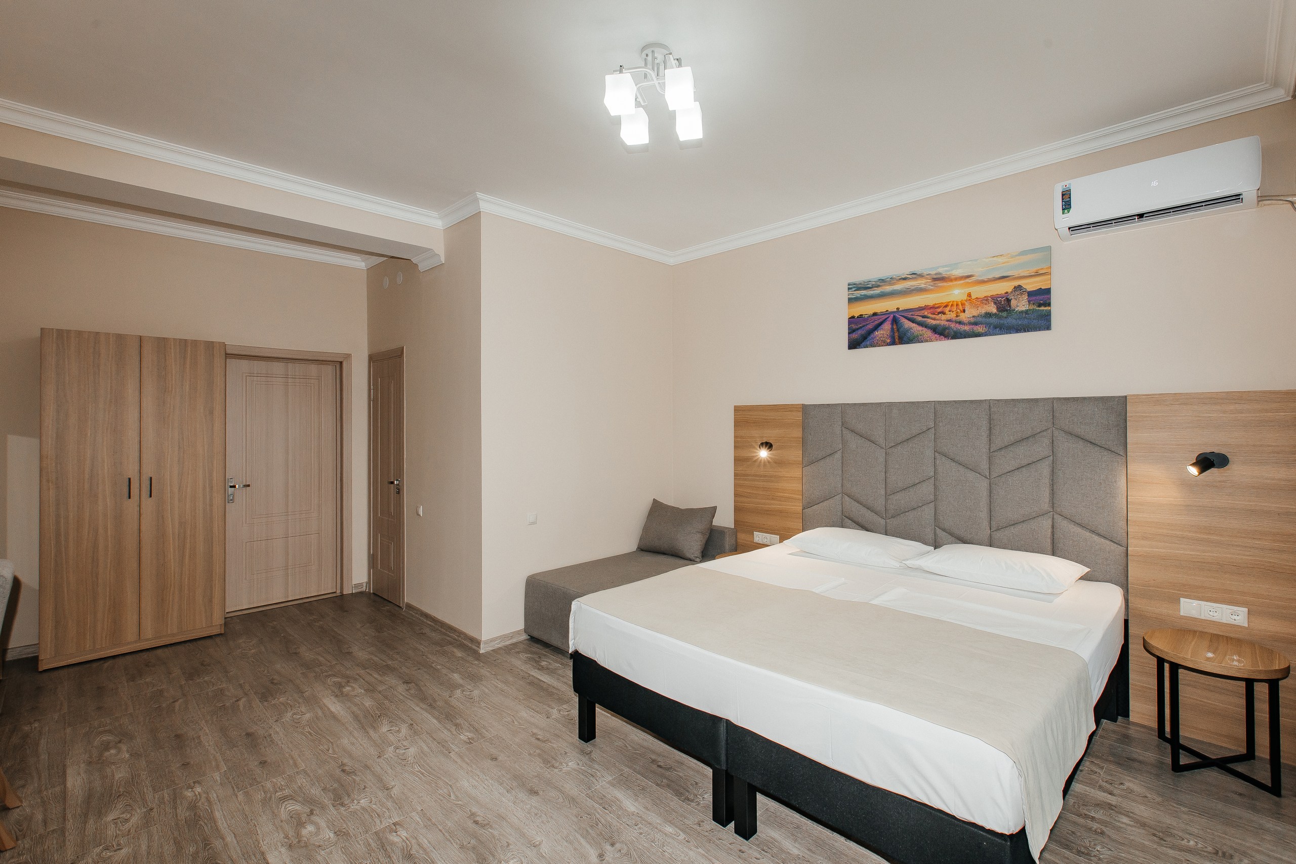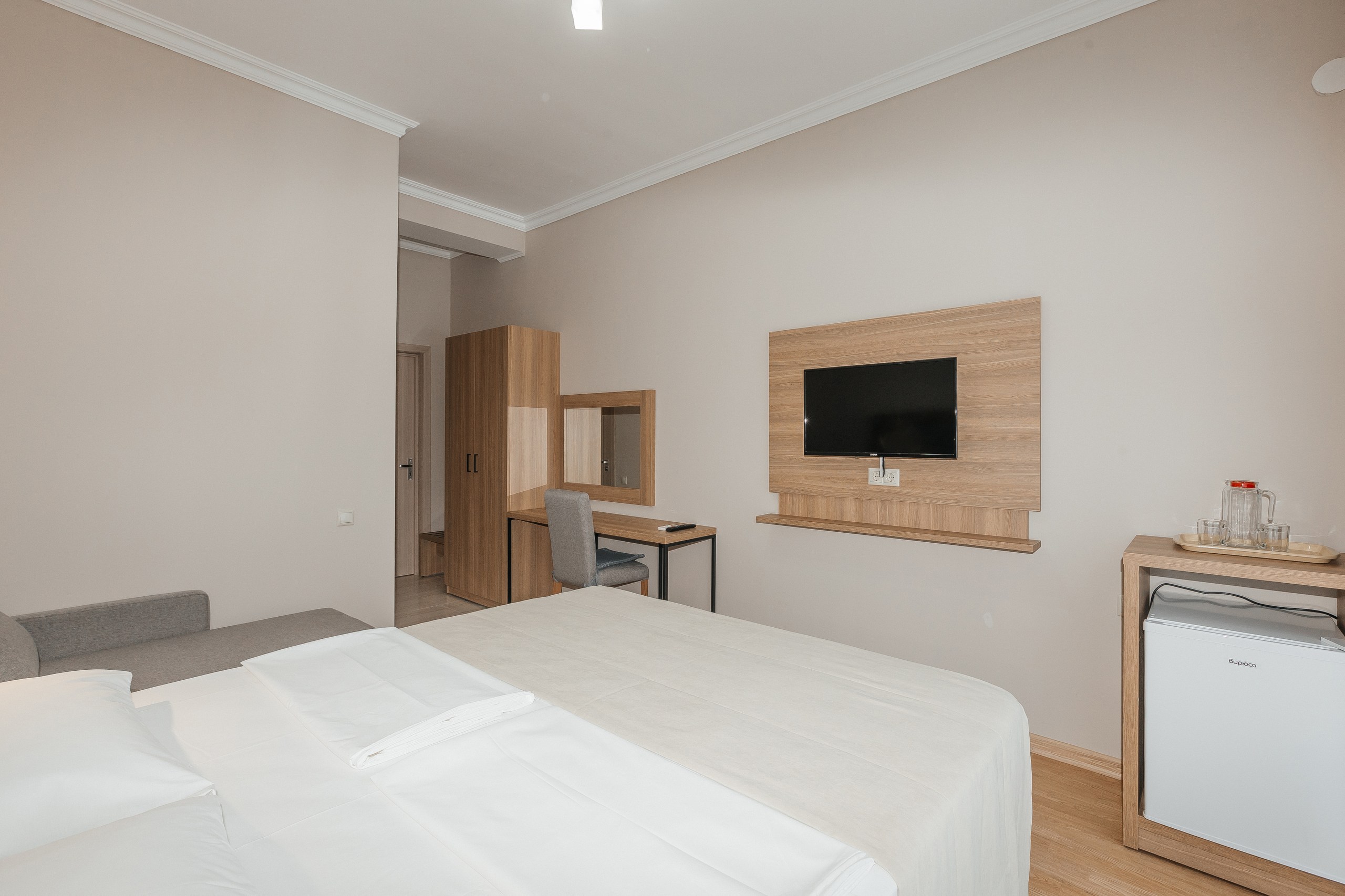 - Мебель: вешалка, зеркало, кресло-кровать, кровать двуспальная, прикроватные тумбочки, шкаф