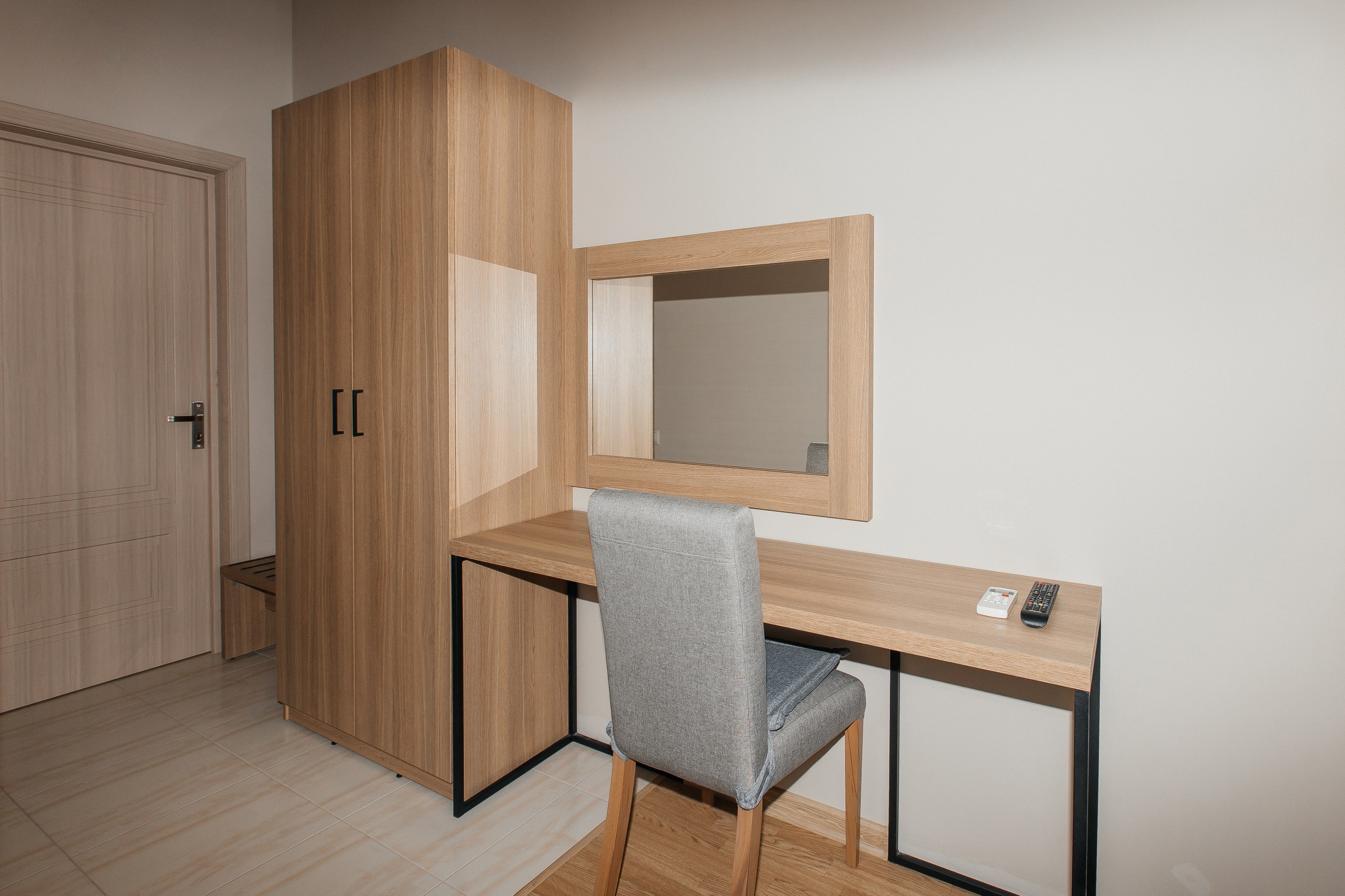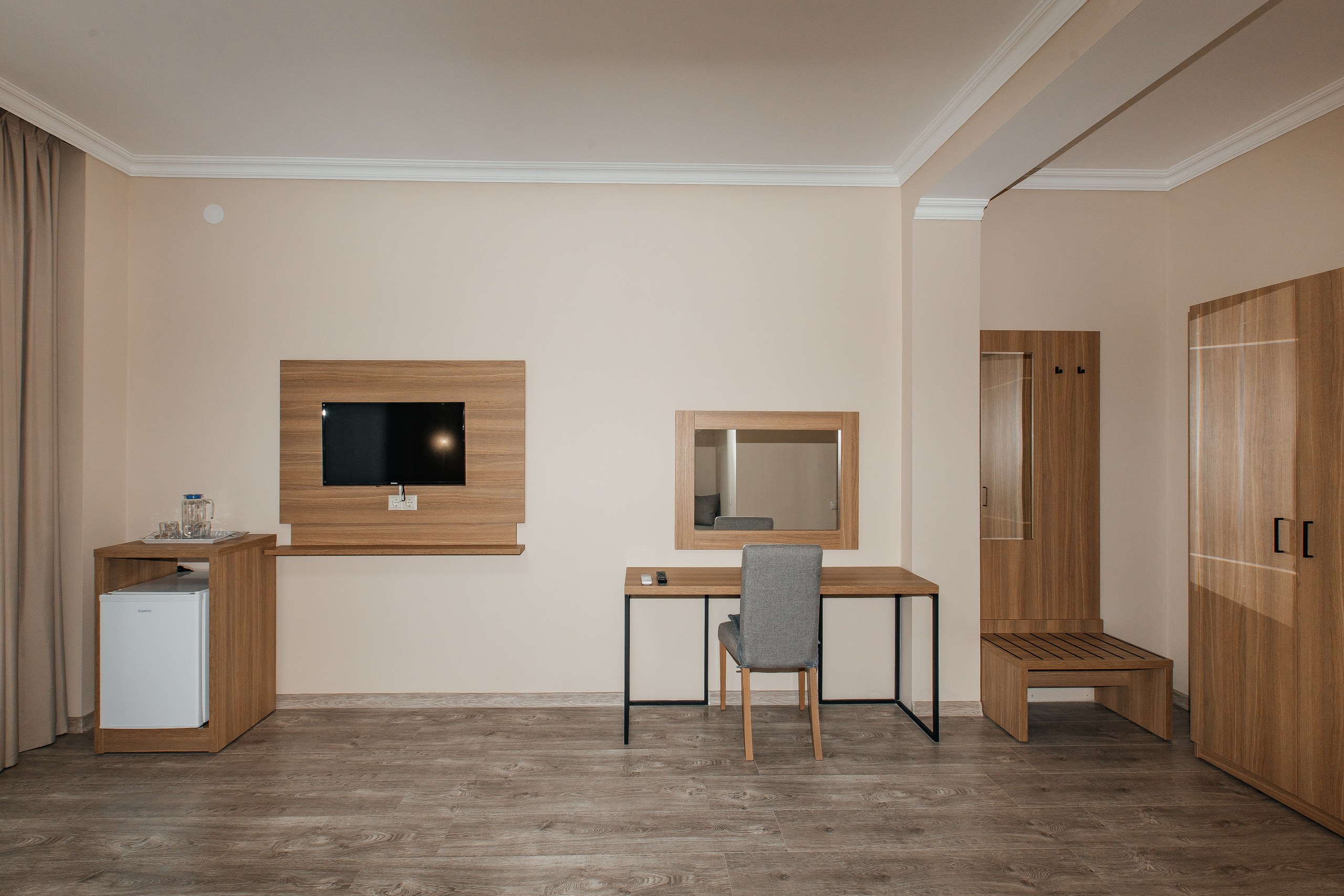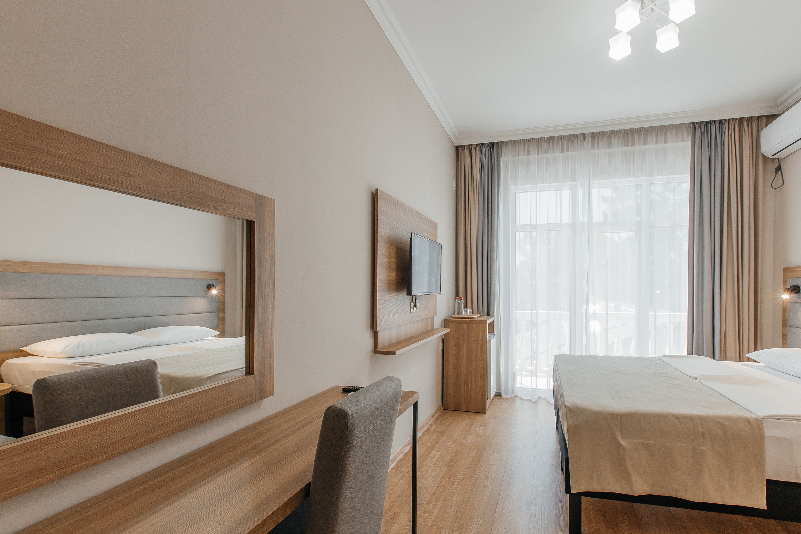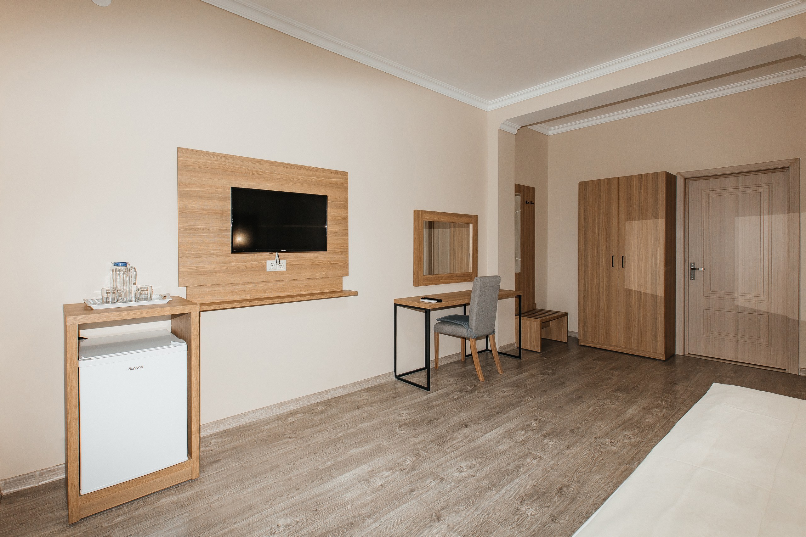 - Мебель: вешалка, зеркало, кресло-кровать, кровать двуспальная, прикроватные тумбочки, шкаф
